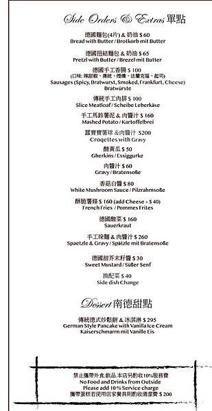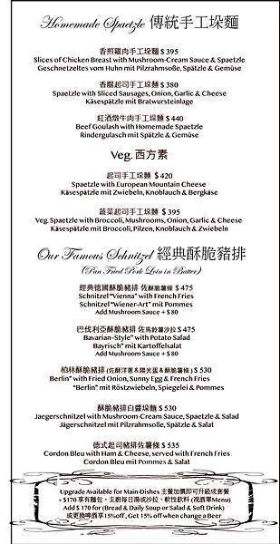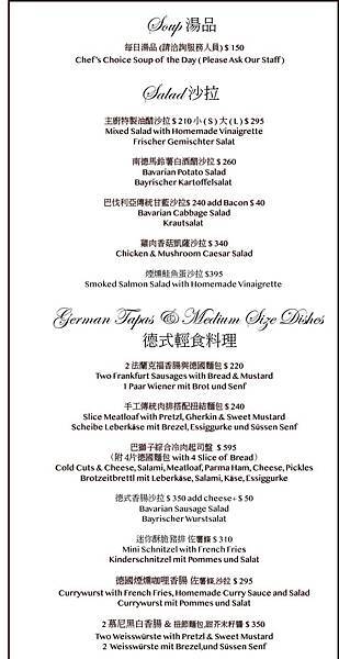 但到了樓下又是不同的風情了,很有德國beer garden的情調。菜單種類包含各式肉類🥩、啤酒🍺、烤雞🐔、生菜🥬和扭結麵包(Brezel)🍞等。